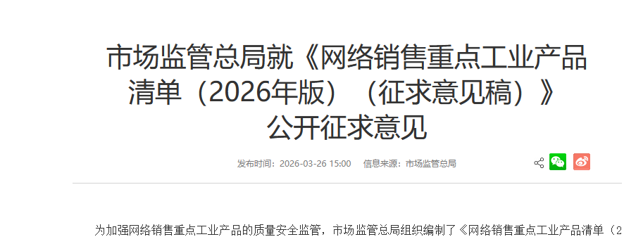 为加强网络销售重点工业产品的质量安全监管,市场监管总局组织编制了《网络销售重点工业产品清单(2026年版)(征求意见稿)》(以下简称《清单》),自即日起至4月26日公开征求意见。...